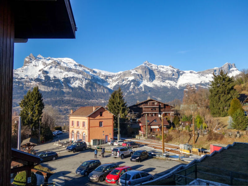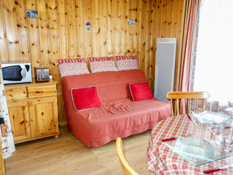 "La pointe des Aravis 3", 1-pokojové studio 20 m2 v 1. patře. Vstupní hala/předsíň s 1x sklápěcím lůžkem (90 cm, v délce 190 cm). Obývací pokoj/jídelna s 1x pohovkou pro 2 osoby (135 cm), TV a s plochou obrazovkou. Vstup na balkon. Kuchyňský kout (malá trouba, toustovač/topinkovač, varná konvice, elektrický kávovar). Koupelna s vanou, samostatné WC. Elektrické topení. Balkon, severní orientace a východní orientace. Pěkný výhled na hory. K dispozici: pračka. Internet (WiFi, extra). Upozornění: nekuřácké ubytování. 1 malý pes povolen. TV pouze v následujících jazycích: FR. Hlásič kouře, bez výtahu.
