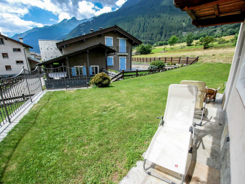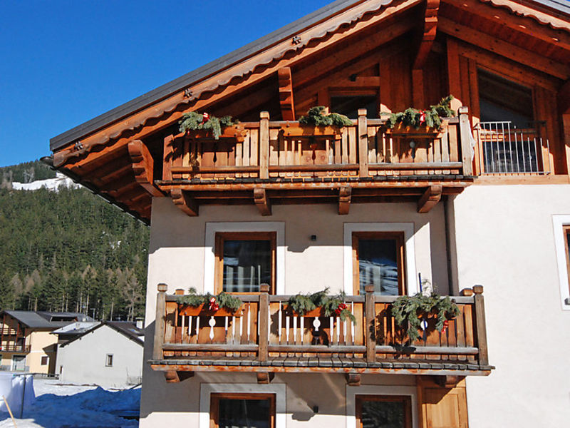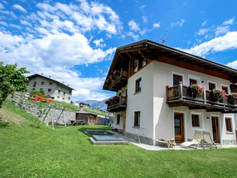 Velká, pěkná chata "La Rugiada", 1'120 m n. . 2-podlažní, rok výstavby 2003, obklopen stromy a loukami. 9 byty v domě. Osada Cepina 5 km od centra Bormio, slunná poloha, 3 km od sjezdovek, na hlavní ulici, jižní orientace.