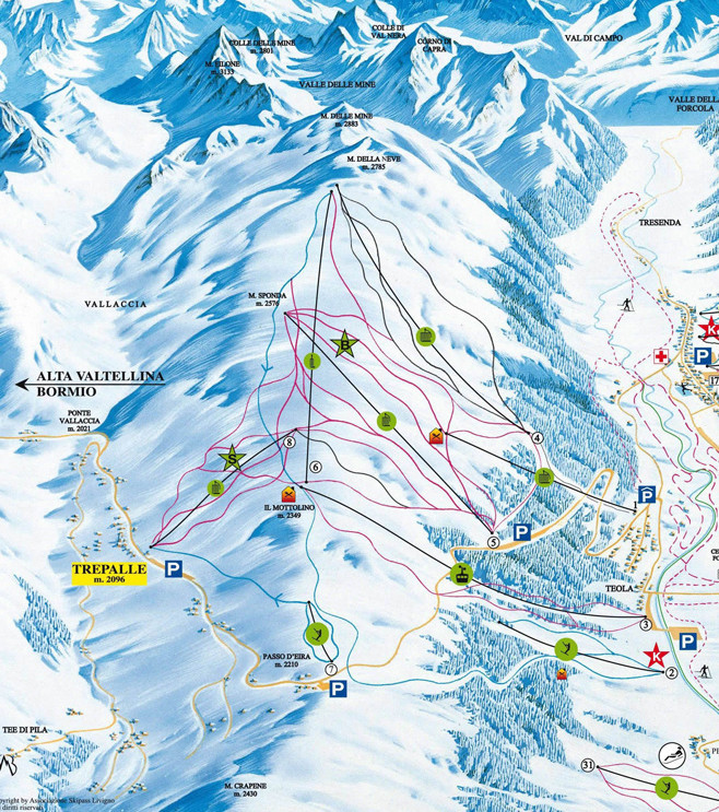 Lyžařský areál Livigno se nachází po obou stranách údolí, v němž leží stejnojmenné městečko Livigno. Protože dolní stanice lanovek leží ve výšce kolem 1.800 - 1.900 metrů a některé sjezdovky dosahují téměř kilometrového převýšení, zdejší tratě leží vesměs nad hranicí lesa a tudíž jsou až neuvěřitelně prostorné. Vysoká nadmořská výška je také zárukou dostatku přírodního sněhu až do pozdního jara.