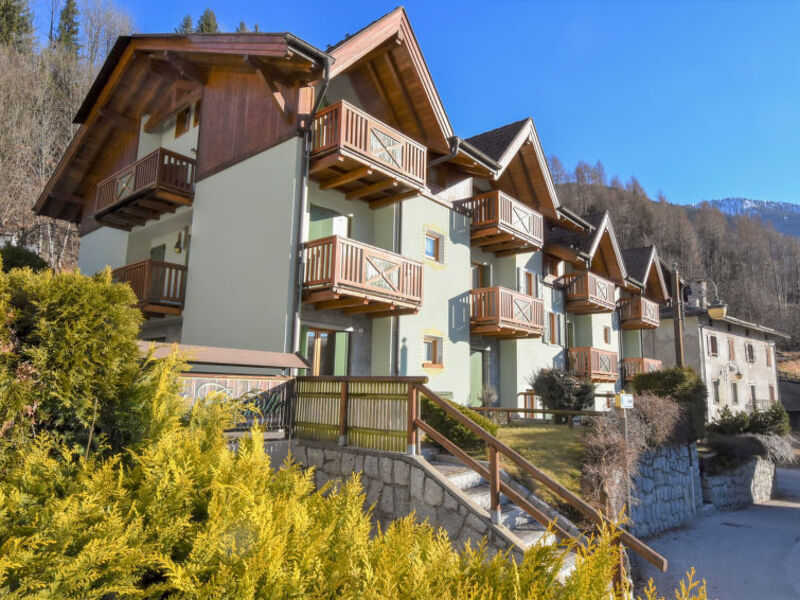 Rezidence "Castello", 3-podlažní, postavená v roce 2005. V osadě Massimeno 1. km od centra Pinzolo, klidná, slunná poloha, 2 km od sjezdovek, na ulici, jižní orientace.