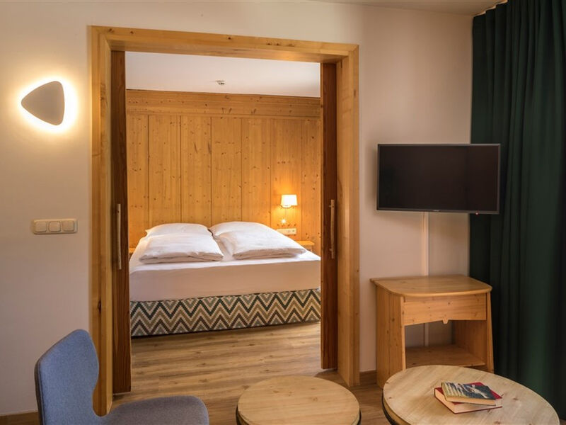 Dvoupokojové rodinné pokoje Comfort: cca 27 m2, pro 2 dosp. a 1-2 děti do 14,99 let, obývací ložnice s patrovou postelí, pokoj s dvoulůžkovou postelí (oddělený posuvnými dveřmi), balkon nebo terasa.