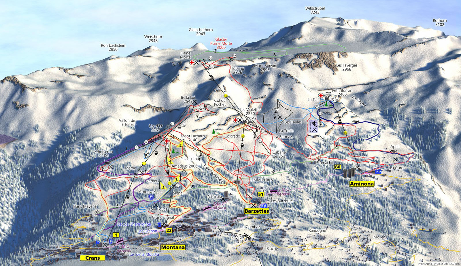 V současnosti je v Crans, Montaně či Aminoně v provozu celkem 9 kilometrů sjezových tratí a dopravu lyžařů na sjezdovky zajišťují 0 lanovky a vleky.